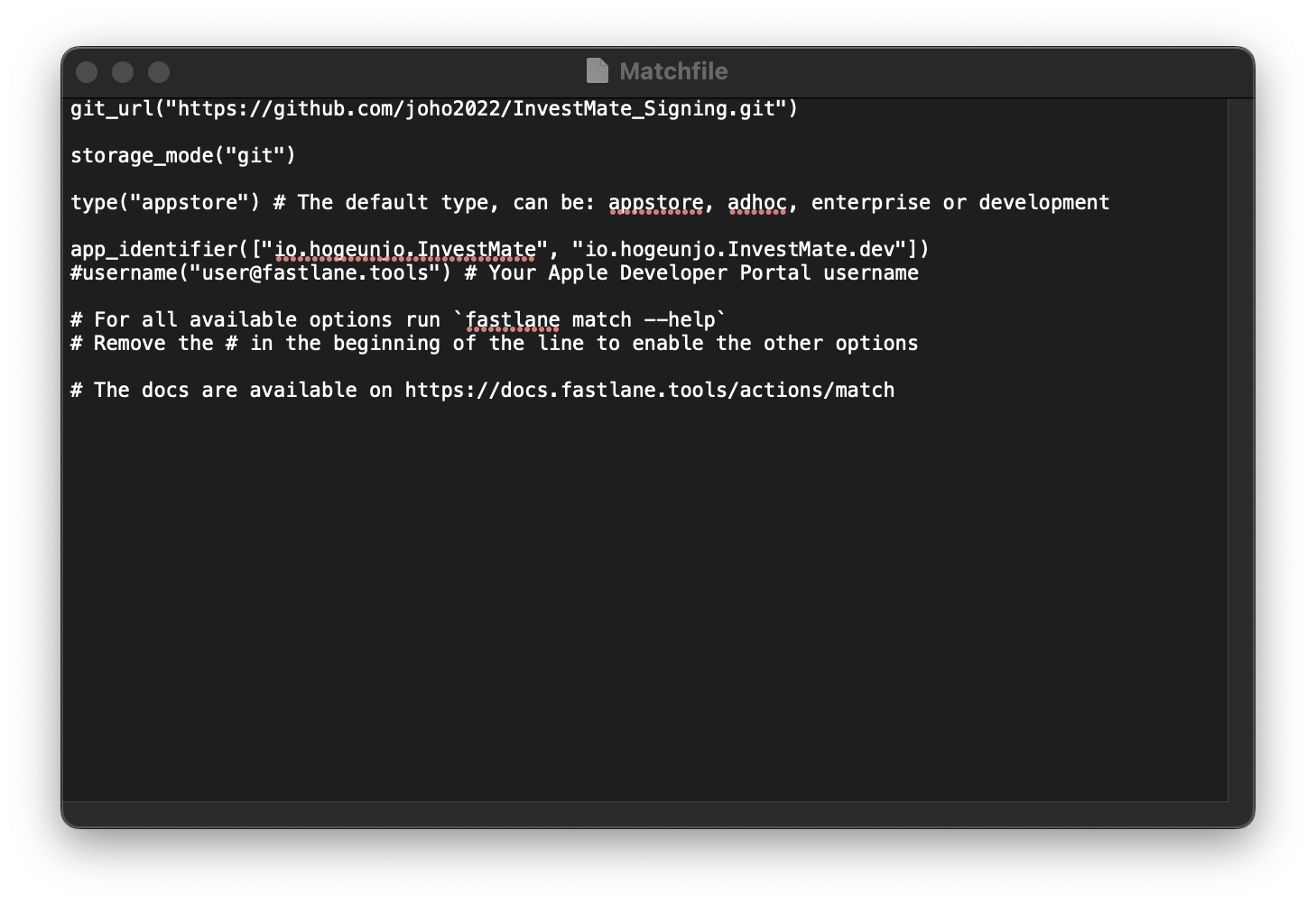 "PROVISIONING_PROFILE_SPECIFIER": "match AppStore io.hogeunjo.InvestMate",