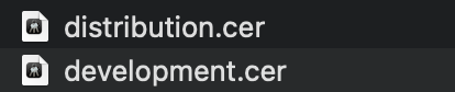 이때 파일이름은 .cer와 .p12는 동일해야 하고