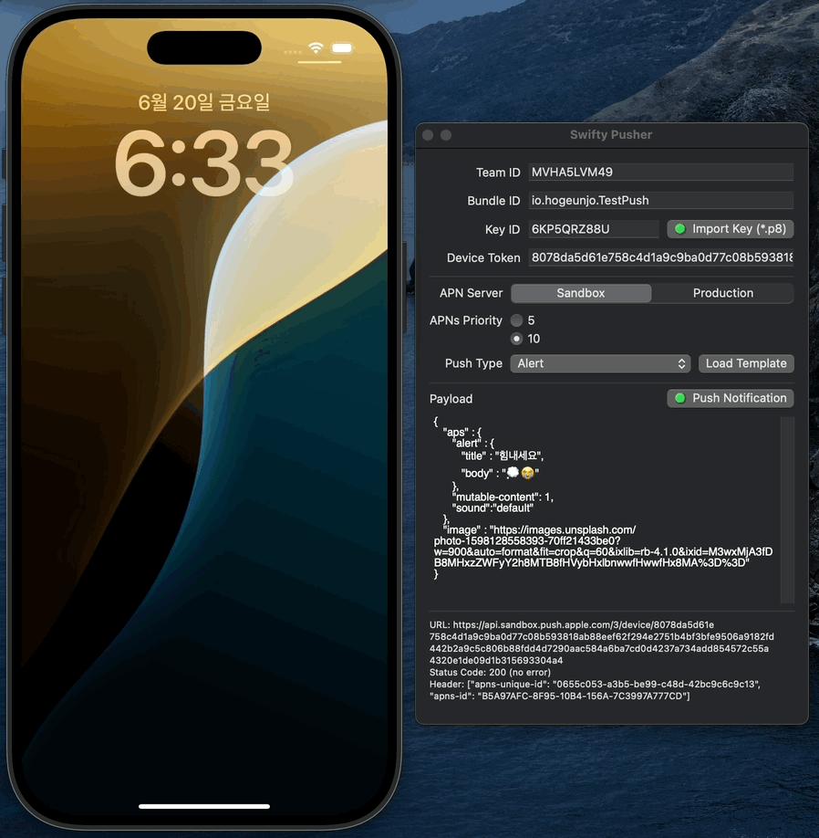 SwiftyPusher라는 맥용 도구를 사용해 테스트를 진행했다.