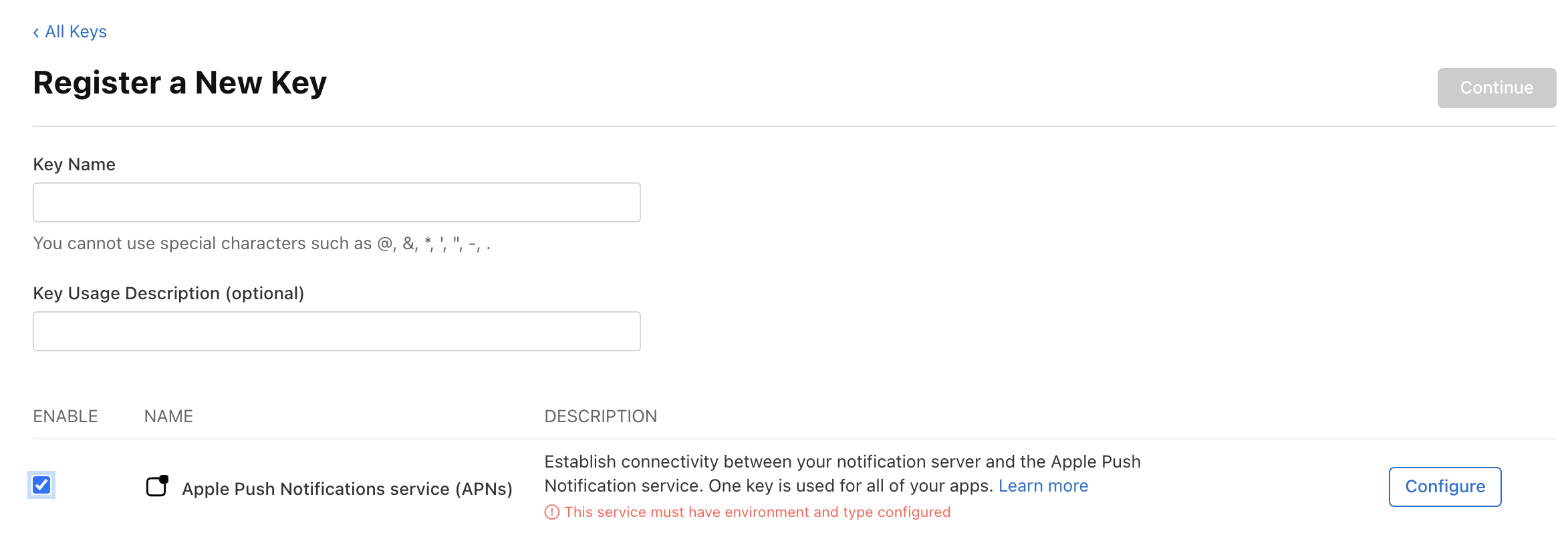 입력 필드를 채워넣고, 등록하면 .p8 파일을 다운로드 한다.