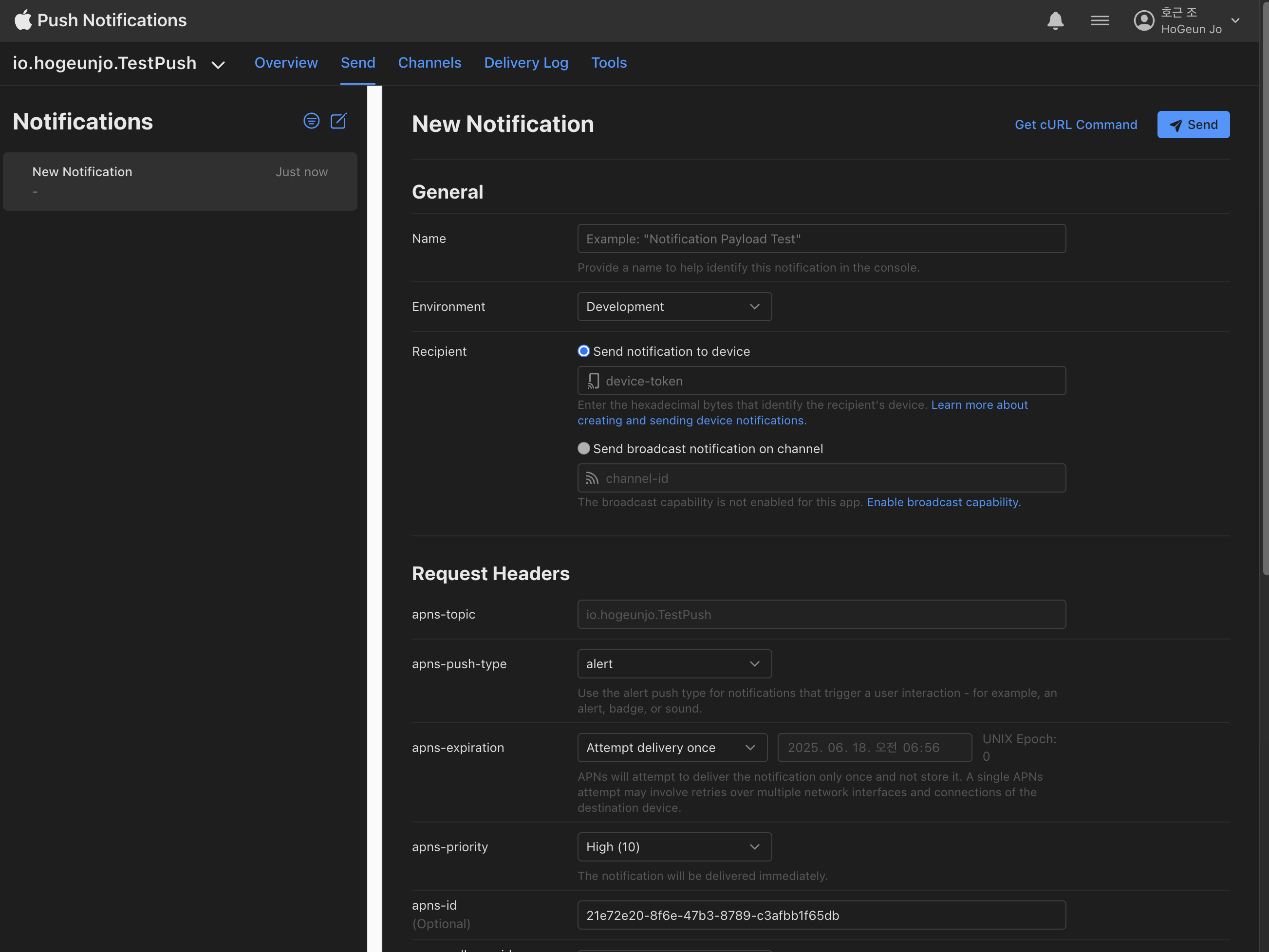 대표적으로 Push Notifications Console 를 사용할 수 있지만, 매번 로그인해야 하는 번거로움 때문에