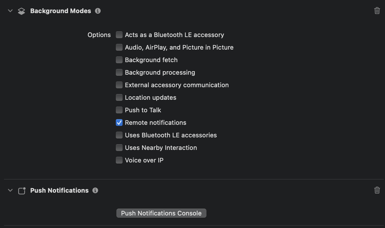 Signing & Capabilities 탭에서 아래 두 개를 추가한다.