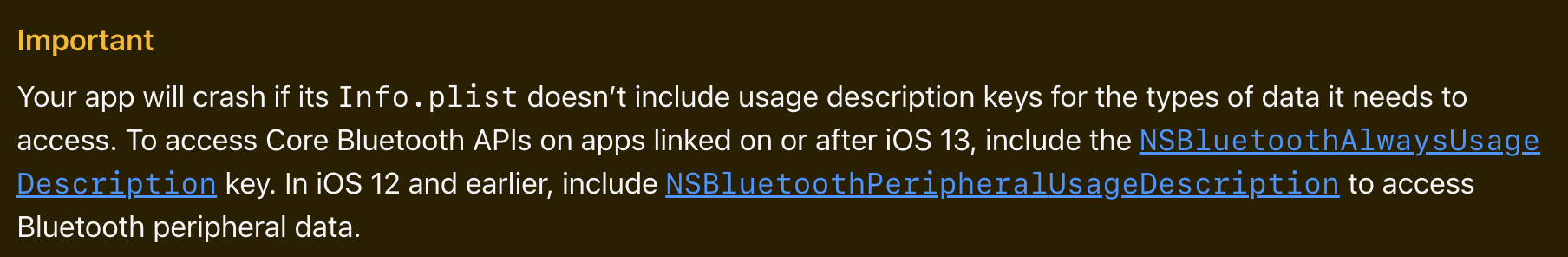 iOS 13부터는 Info.plist에 NSBluetoothAlwaysUsageDescription을 반드시 추가해야 Core Bluetooth 사용 시 앱이 크래시 안 난다.