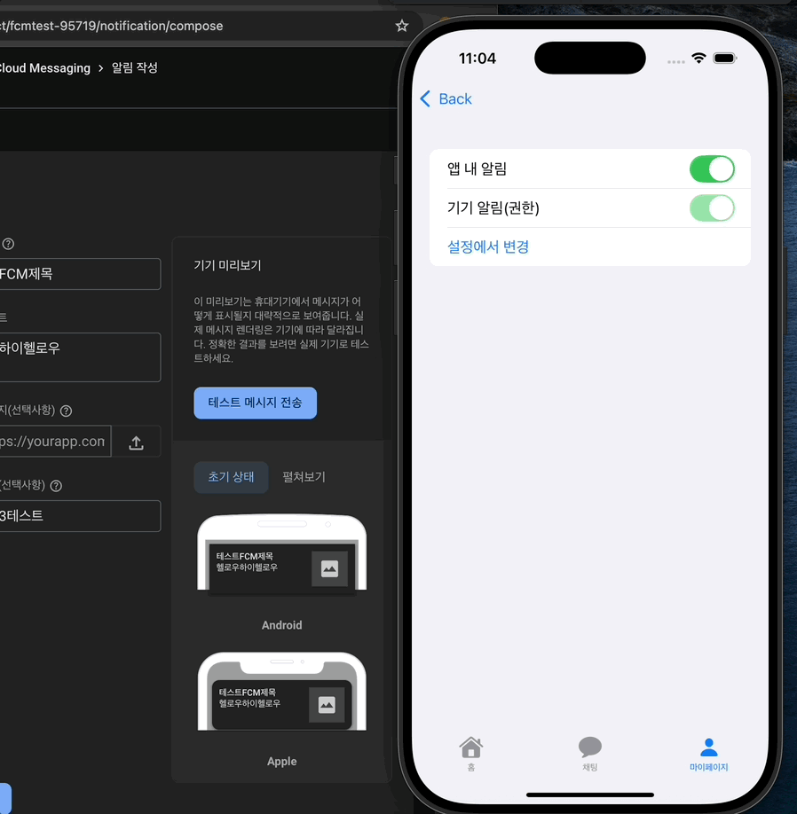 알림 설정 체크와 현재 탭 상태를 비교하여 푸시를 표시할 지, 무시할 지 결정하도록 하였다.